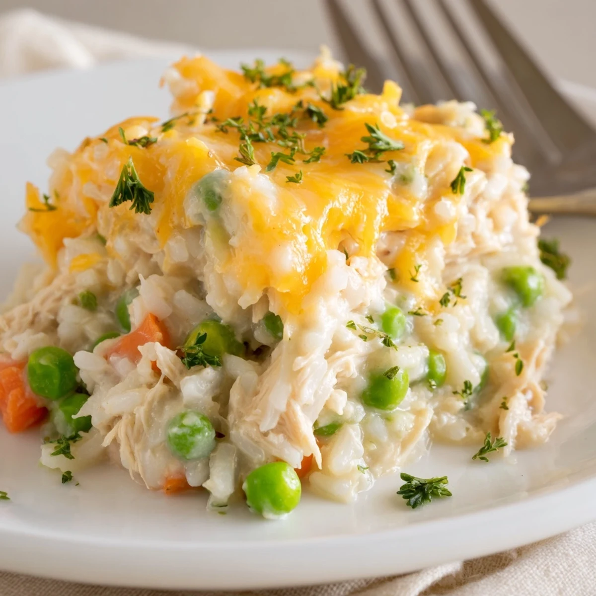 This casserole combines diced cooked chicken with uncooked long-grain rice, sautéed onion and garlic, peas and carrots, sour cream, condensed cream of chicken and a cheddar-mozzarella blend. Mix with chicken broth, bake covered 30 minutes, uncover and top with extra cheddar until bubbling. Let rest 5 minutes before serving; garnish with parsley. Try rotisserie chicken or crispy bacon for variation.