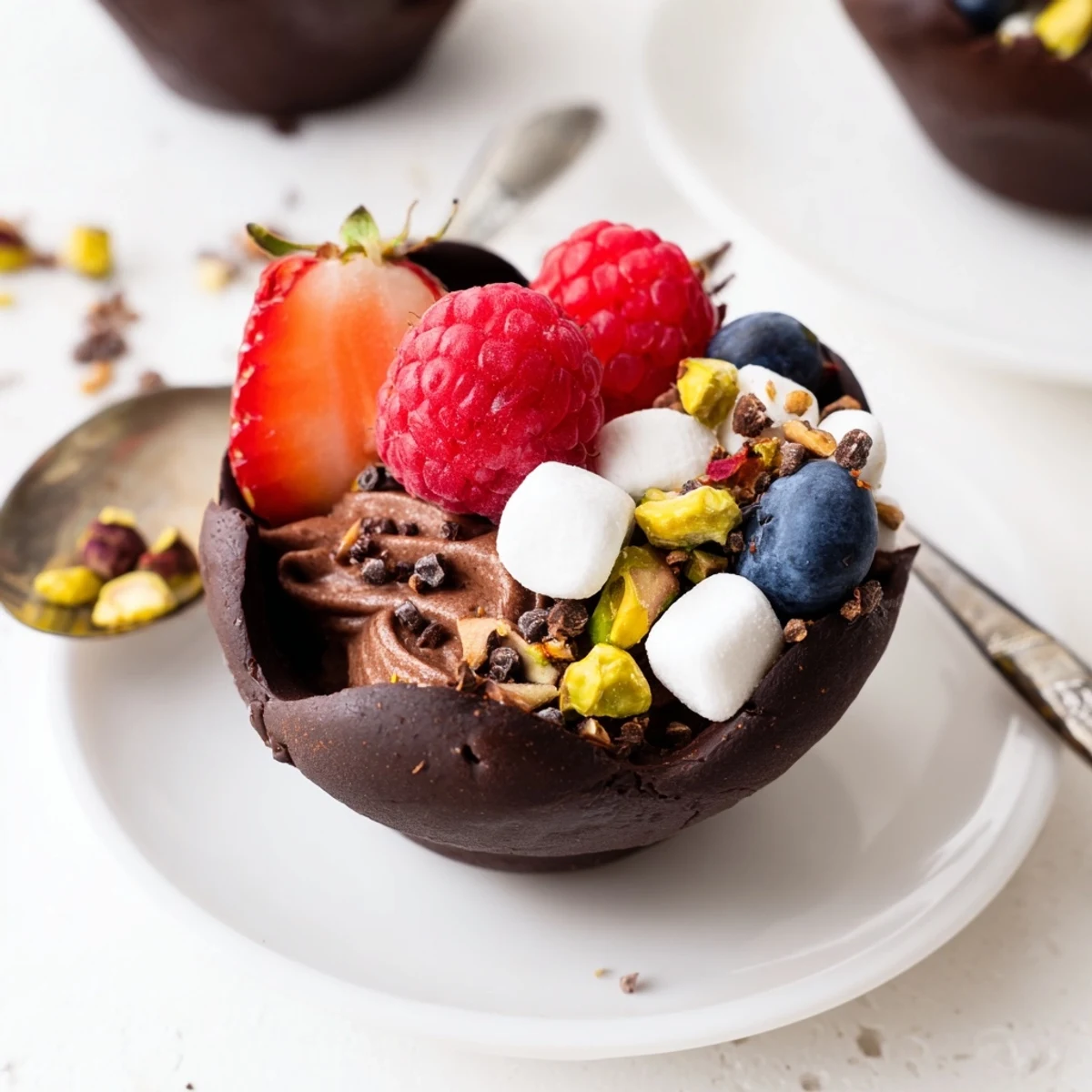 The chocolate cups can be made up to three days in advance if stored in an airtight container between layers of parchment paper. The mousse holds its texture beautifully for 24 hours in the fridge, though I recommend adding the fresh berries and marshmallows no more than an hour before serving so they stay perky and fresh.