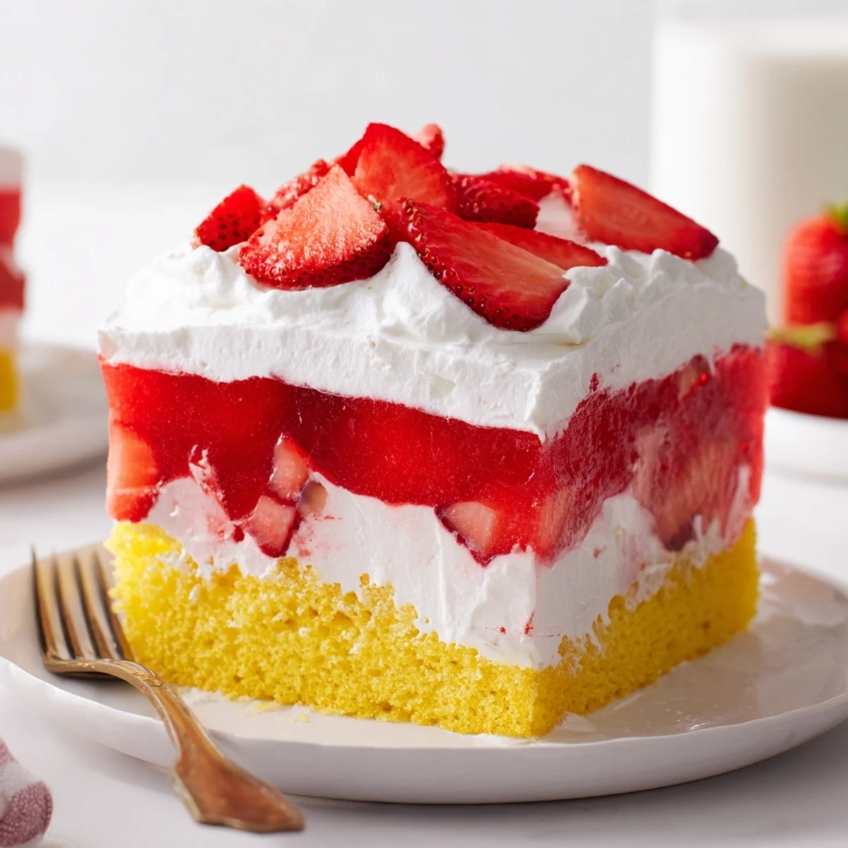 This light and airy dessert transforms a simple boxed cake mix into something special by infusing it with sweet strawberry gelatin. After baking and cooling the cake, create deep wells throughout the surface, then pour prepared strawberry gelatin over the top, allowing it to seep into every crevice. A few hours in the refrigerator lets the flavors meld while the gelatin sets into a jiggly, bright layer. Finish with clouds of whipped topping and fresh strawberry slices for a dessert that's as beautiful as it is delicious.