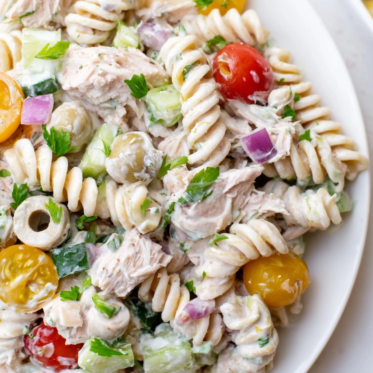 This chilled tuna pasta salad combines al dente pasta with flaky tuna, cherry tomatoes, crisp vegetables, and a tangy creamy dressing. Ready in 25 minutes, it's an ideal make-ahead dish for summer gatherings, work lunches, or quick weeknight dinners.